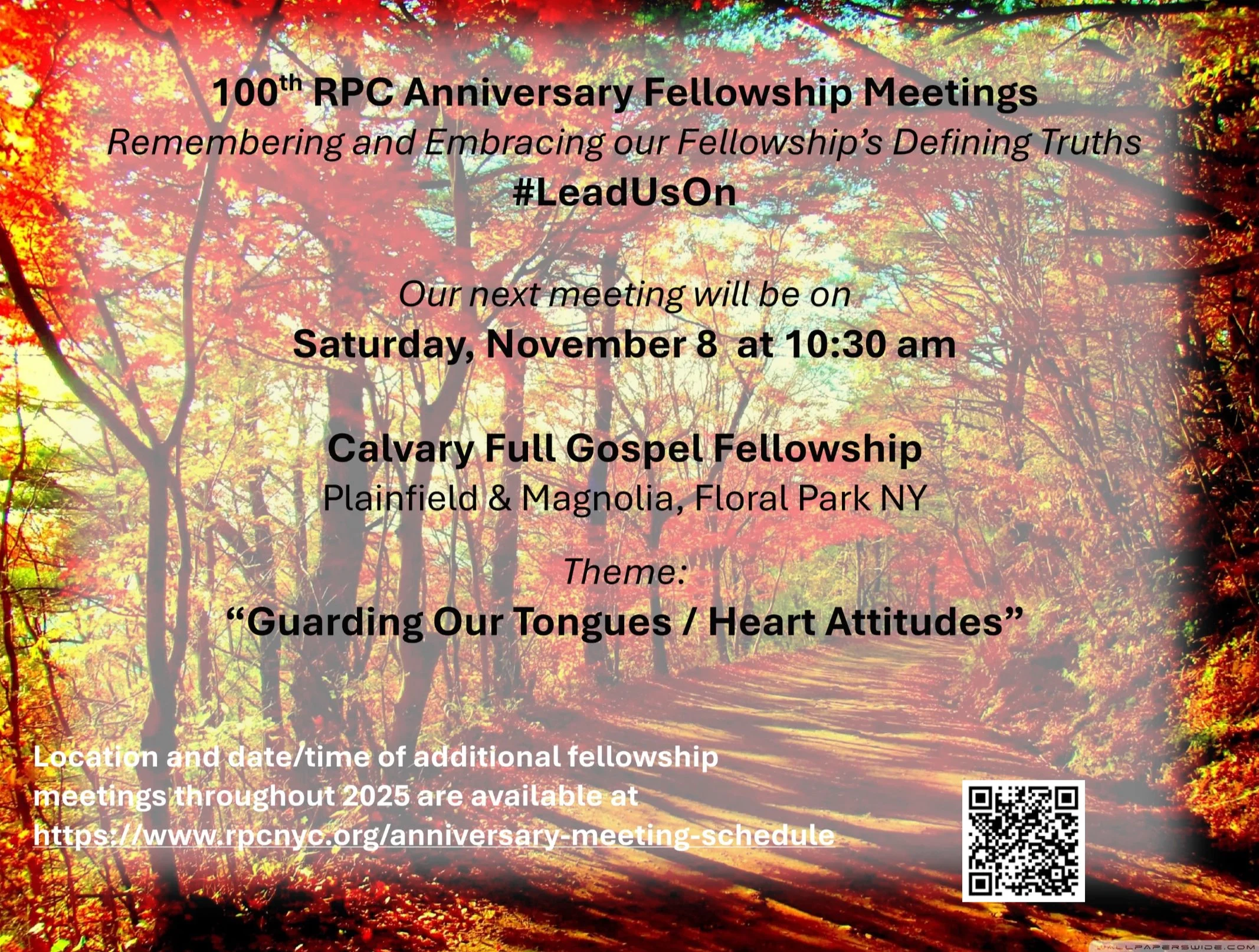 In honor of RPC’s 100th Anniversary, the Fellowship presents a series that explains why we do what we do, and what we cherish together. These services, which will also include worship, are scheduled at various churches on the East coast throughout 2025, and Session 8 will be @ Calvary Full Gospel Fellowship on Saturday, Nov. 8th at 10:30AM. Don’t miss this opportunity to nourish your mind and spirit, and to connect with other believers in Christ!